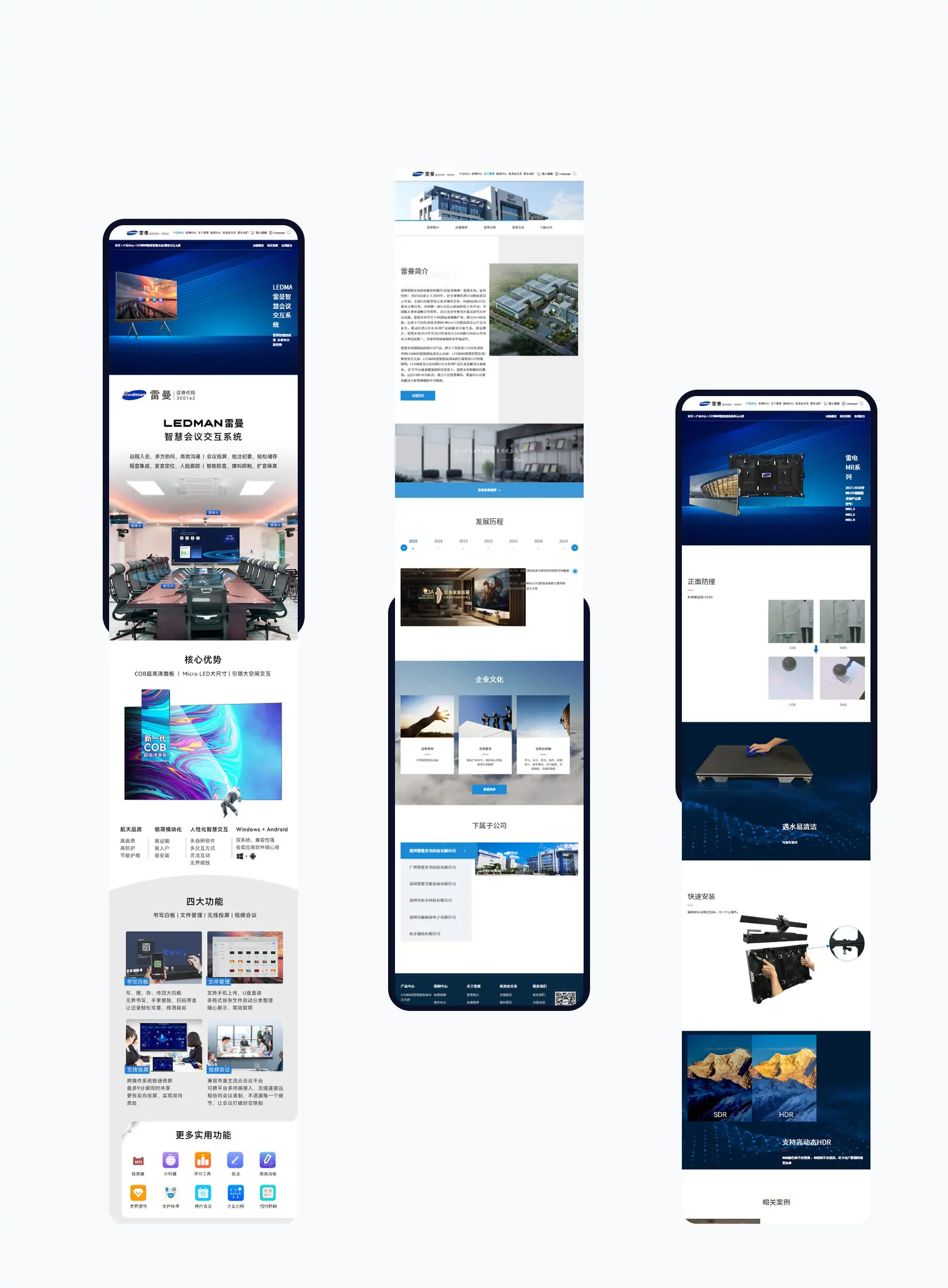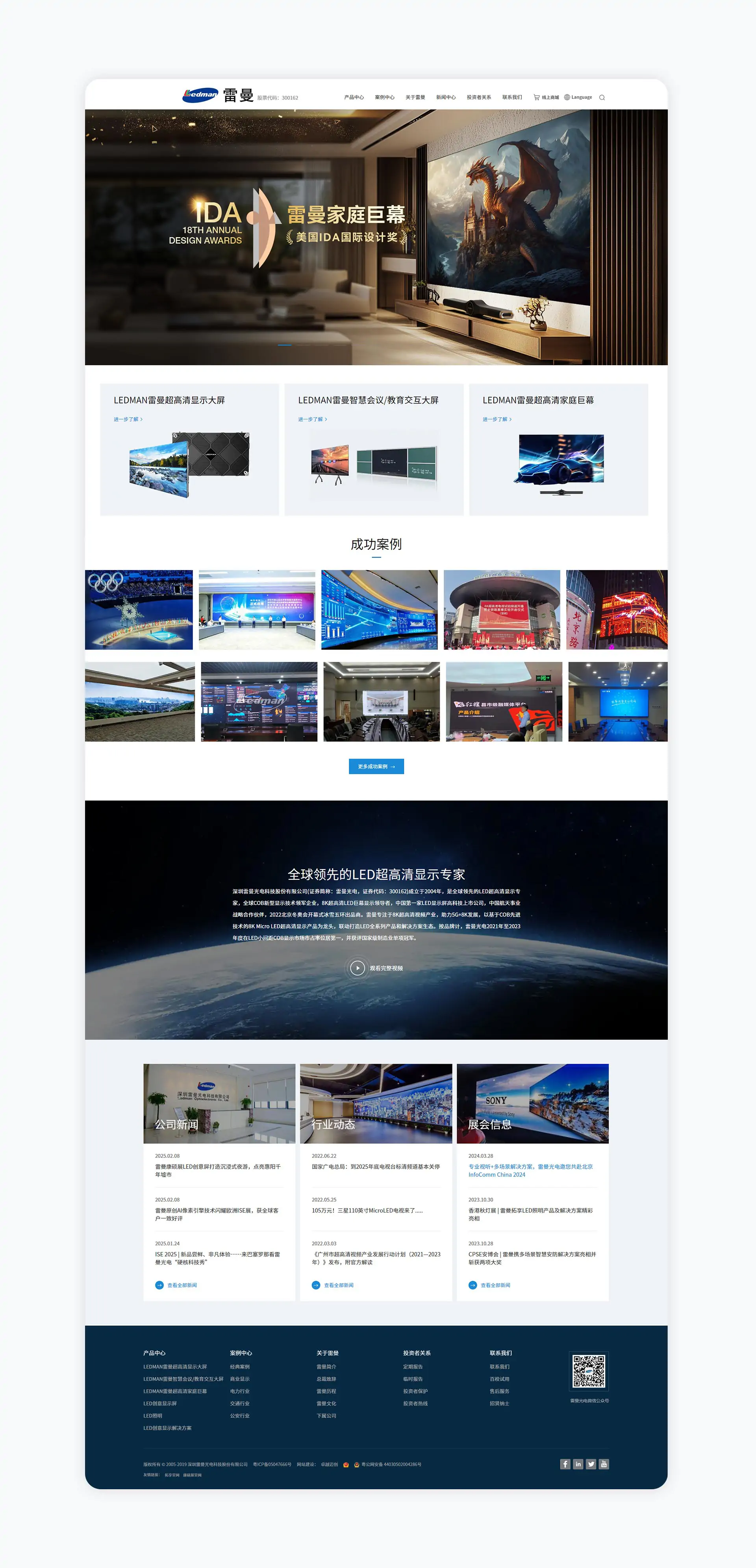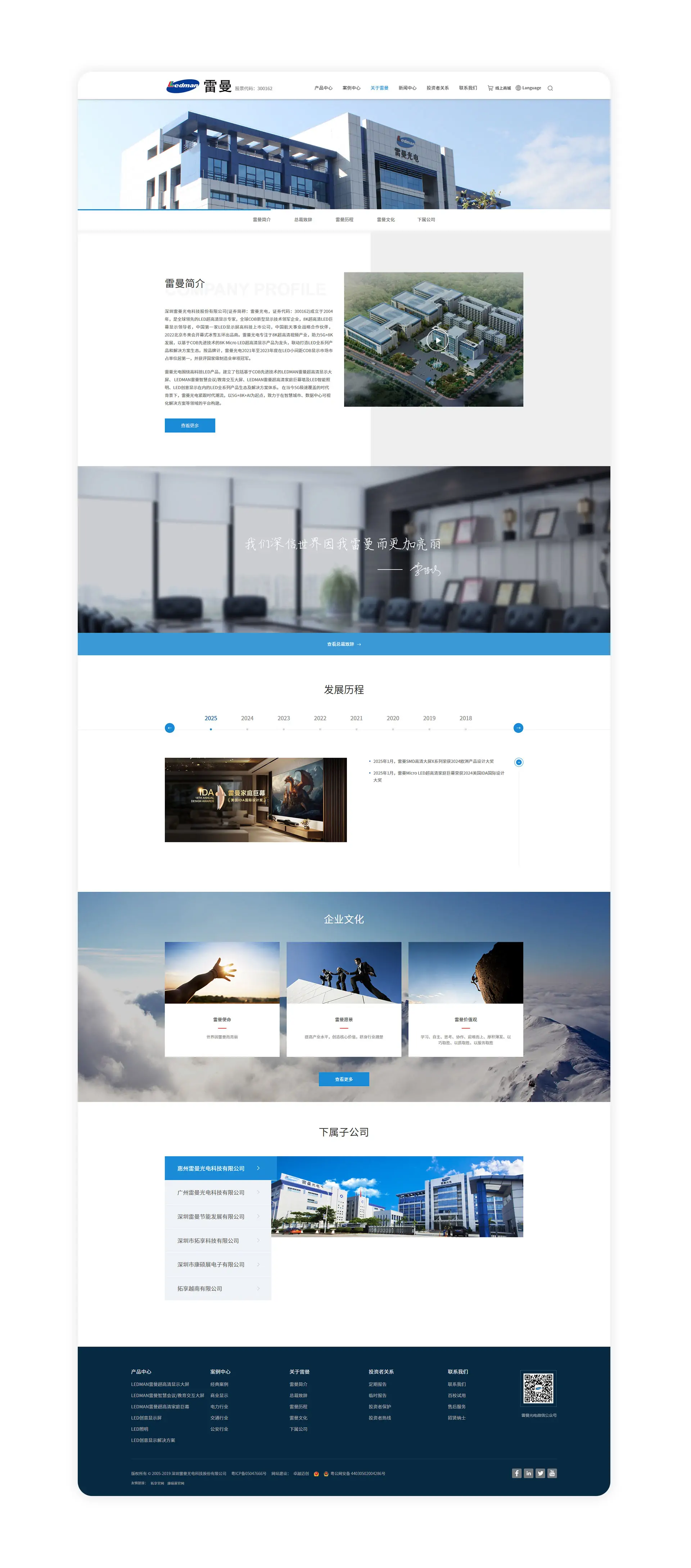 深圳雷曼光电科技股份有限公司(证券简称:雷曼光电,证券代码:300162)成立于2004年,是全球领先的LED超高清显示专家,全球COB新型显示技术领军企业,8K超高清LED巨幕显示领导者,中国第一家LED显示屏高科技上市公司,中国航天事业战略合作伙伴,2022北京冬奥会开幕式冰雪五环出品商。雷曼专注于8K超高清视频产业,助力5G+8K发展,以基于COB先进技术的8K Micro LED超高清显示产品为龙头,联动打造LED全系列产品和解决方案生态。按品牌计,雷曼光电2021年至2023年度在LED小间距COB显示市场市占率位居第一,并获评国家级制造业单项冠军。